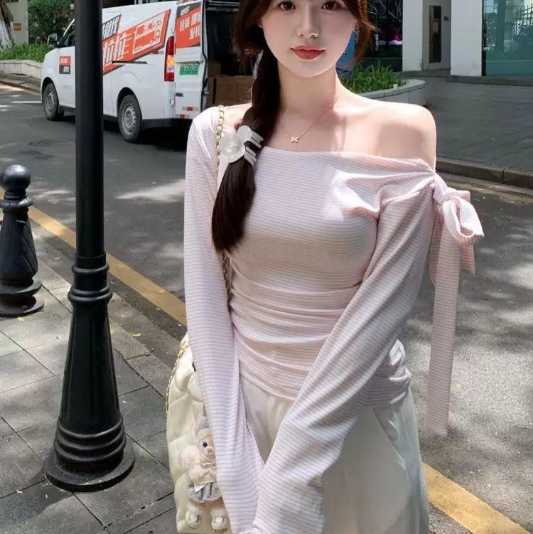 Pink stripe off shoulder tee🫶🏻✨