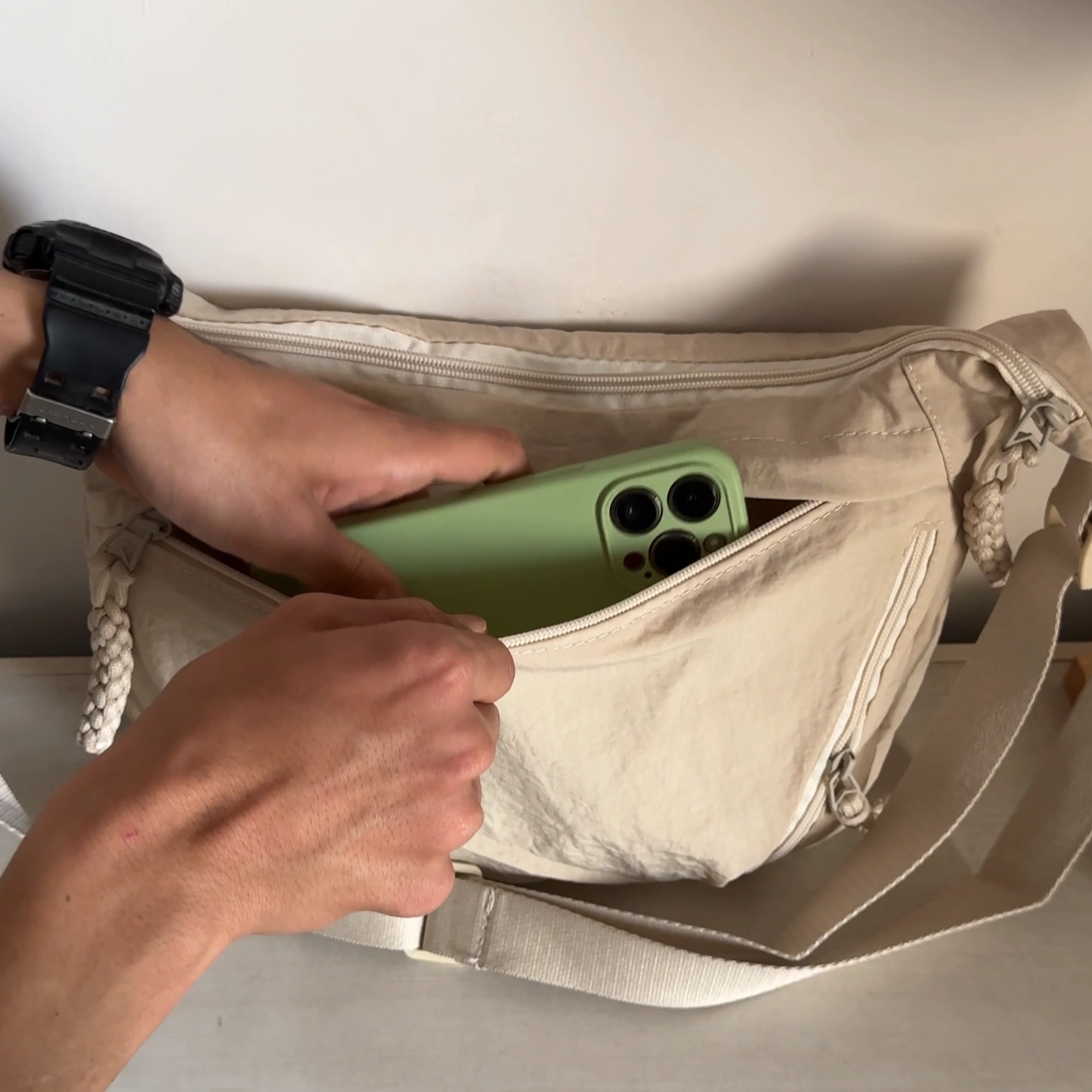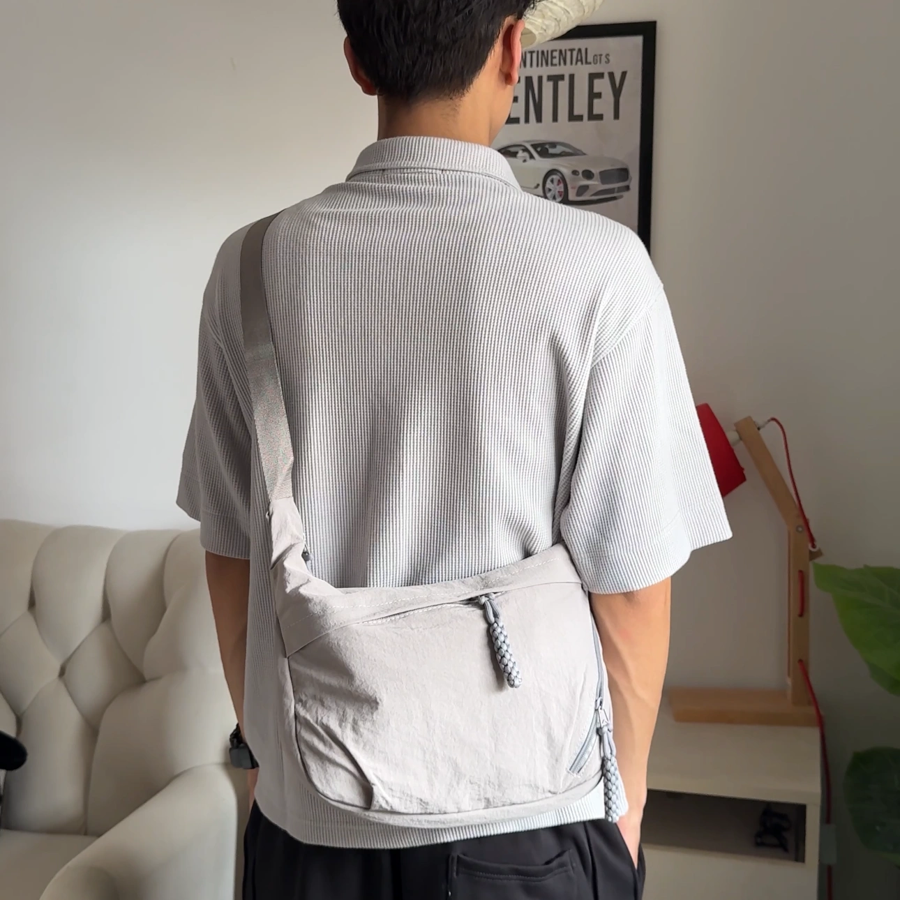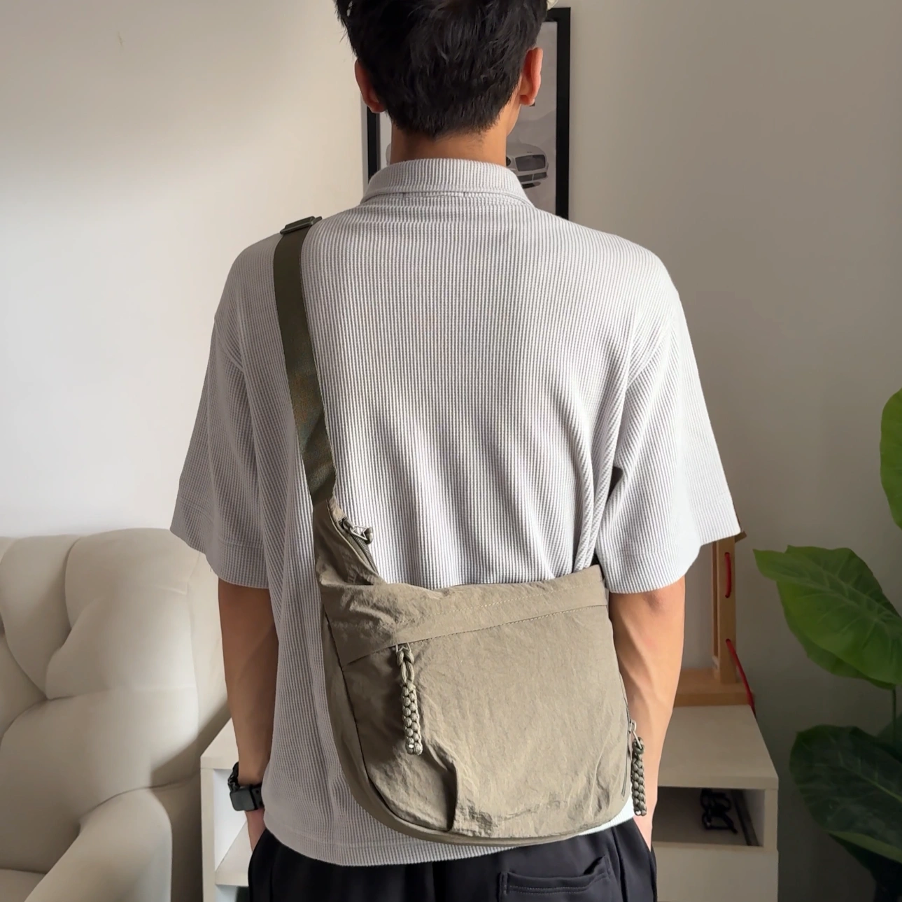 loved by everyone for its multipockets. suitable for everyone any age for daily use .has padded compartment inside to keep your techs safe .medium size and spacious adjustable strap
